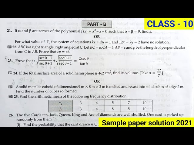 Cbse Class 10th Standard Mathematics Sample Paper Solutions 2021 Part A Mathematics Analysis Youtube